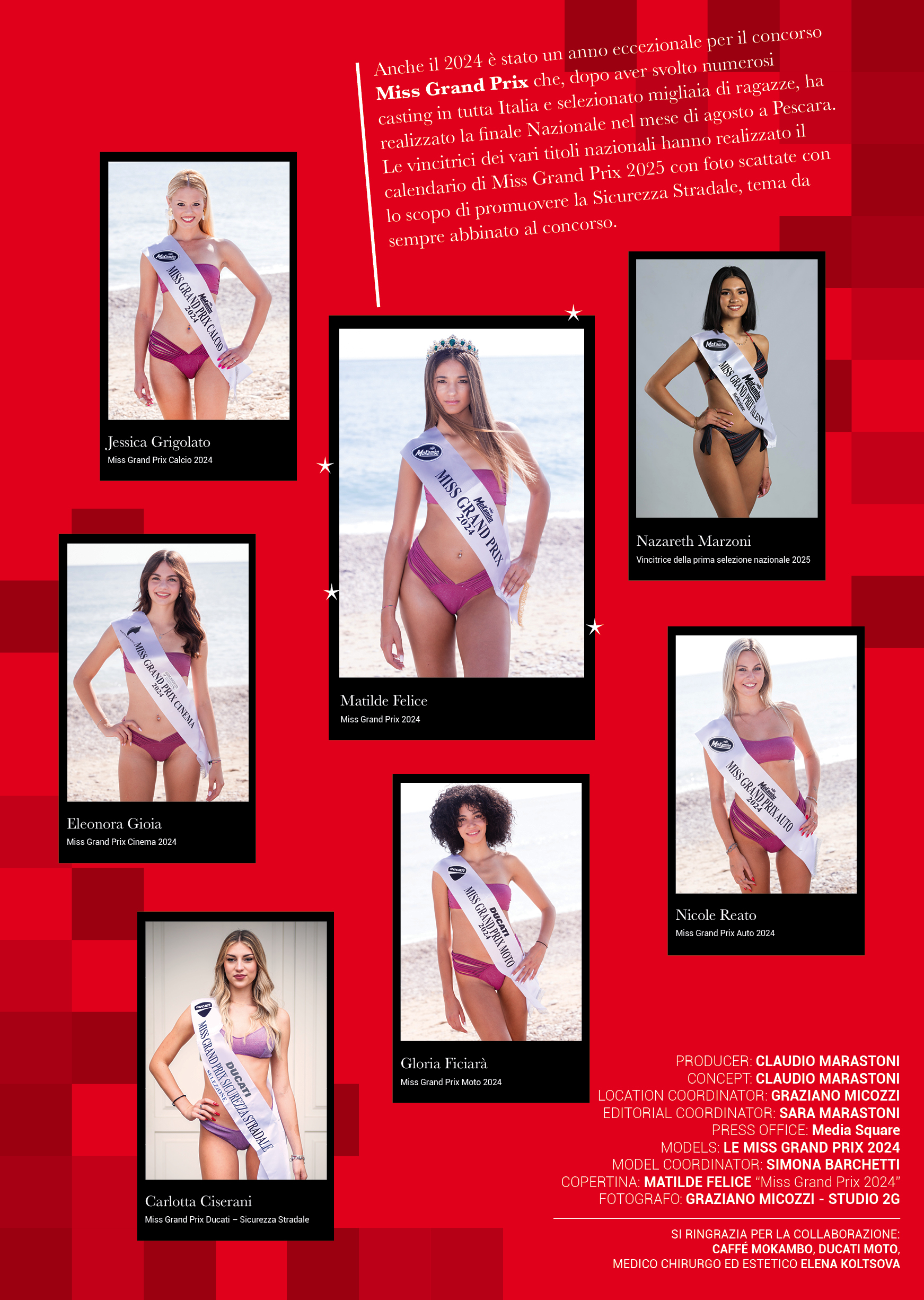 Le ragazze, che hanno posato per l’obiettivo di Graziano Micozzi di Studio 2G, hanno conquistato le fasce nazionali all’ultima edizione di Miss Grand Prix, iniziando dalla vincitrice assoluta Matilde Felice e proseguendo con le fasciate Jessica Grigolato (calcio), Nicole Reato (auto), Eleonora Gioia (cinema), Gloria Ficiarà (moto), oltre che alla vincitrice della “prima nazionale” Nazareth Marzoni e a Miss Grand Prix Sicurezza Stradale Carlotta Ciserani. Un ringraziamento anche agli scatti di Alex Pantò, Paolo Stramare, Valerio Gioviani, Davide Morello.